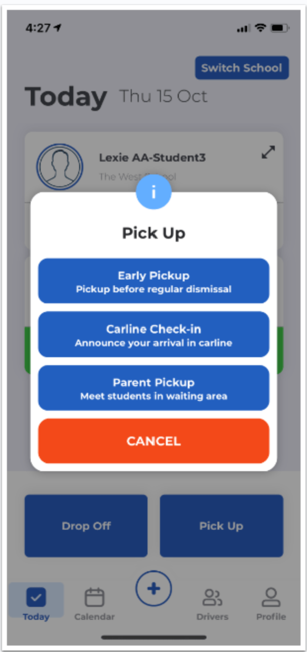 The drop off and pickup buttons in SchoolPass app allow parents and authorized drivers to fulfill school requirements for arrival and dismissal, such as providing signatures, reasons for departure/late arrival, indication as to whether a student will return from an early dismissal, and more. CHA uses these buttons as a part of the daily dismissal process, and parents must use the Pickup option to notify students and staff that they are in the carline or have walked up to the front of the building, and are within a geo fenced area for dismissal.